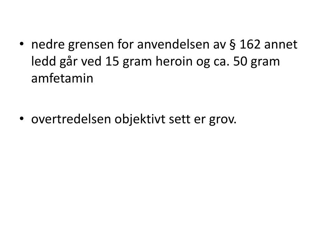 nedre grensen for anvendelsen av § 162 annet ledd går ved 15 gram heroin og ca. 50 gram amfetamin • overtredelsen objektivt sett er grov.