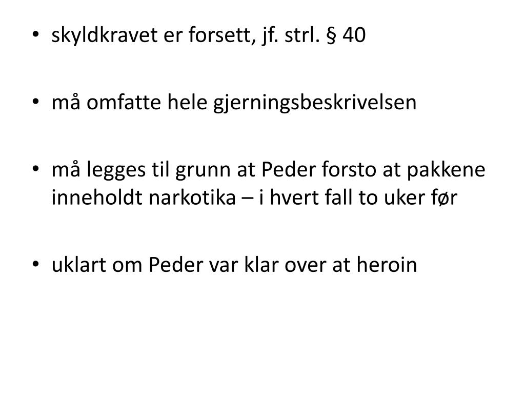 skyldkravet er forsett, jf. strl. § 40 • må omfatte hele gjerningsbeskrivelsen • må legges til grunn at Peder forsto at pakkene inneholdt narkotika – i hvert fall to uker før • uklart om Peder var klar over at heroin