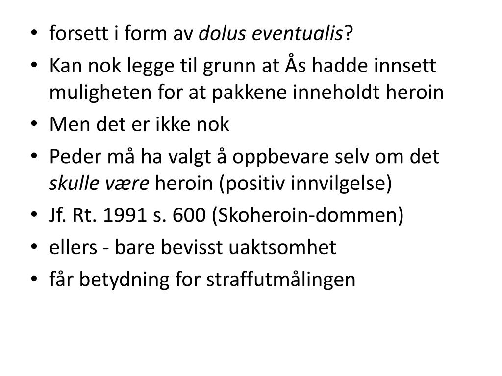 forsett i form av doluseventualis? • Kan nok legge til grunn at Ås hadde innsett muligheten for at pakkene inneholdt heroin • Men det er ikke nok • Peder må ha valgt å oppbevare selv om det skulle være heroin (positiv innvilgelse) • Jf. Rt. 1991 s. 600 (Skoheroin-dommen) • ellers - bare bevisst uaktsomhet • får betydning for straffutmålingen