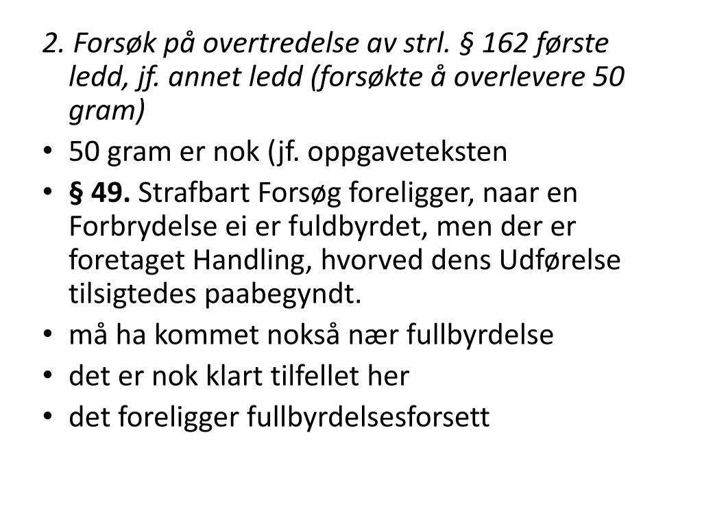 2. Forsøk på overtredelse av strl. § 162 første ledd, jf. annet ledd (forsøkte å overlevere 50 gram) • 50 gram er nok (jf. oppgaveteksten • § 49. Strafbart Forsøg foreligger, naar en Forbrydelse ei er fuldbyrdet, men der er foretaget Handling, hvorved dens Udførelse tilsigtedes paabegyndt. • må ha kommet nokså nær fullbyrdelse • det er nok klart tilfellet her • det foreligger fullbyrdelsesforsett