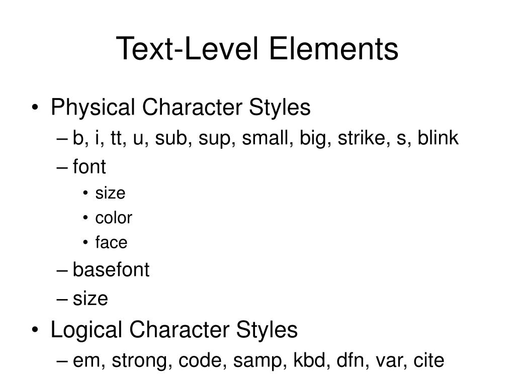 Text-Level Elements • Physical Character Styles • b, i, tt, u, sub, sup, small, big, strike, s, blink • font • size • color • face • basefont • size • Logical Character Styles • em, strong, code, samp, kbd, dfn, var, cite