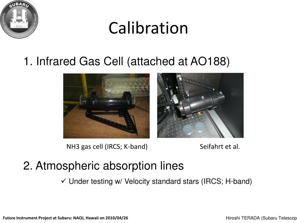 Calibration 1. Infrared Gas Cell (attached at AO188) NH3 gas cell (IRCS; K-band) Seifahrt et al. 2. Atmospheric absorption lines • Under testing w/ Velocity standard stars (IRCS; H-band) Future Instrument Project at Subaru: NAOJ, Hawaii on 2010/04/26 Hiroshi TERADA (Subaru Telescope)