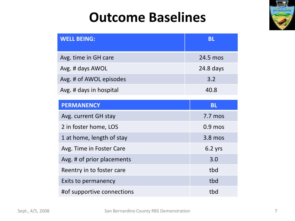 Primary Outcome Focus • Reduced Length of Stay • Reduced level of care including out of state • Reduced Hospitalizations • Reduced AWOL incidents • Improved Permanency • Stable placement • Increased pro-social behavior • Life long connections Stakeholder-Driven San Bernardino County RBS Demonstration