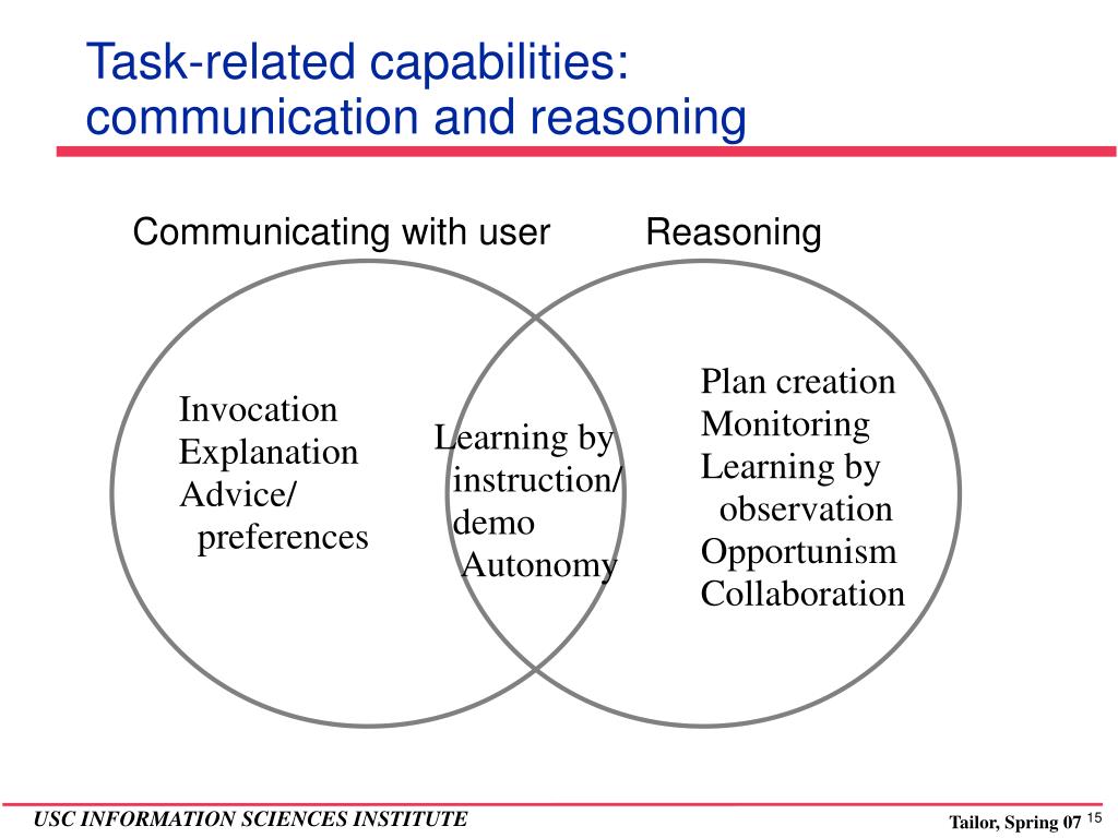 Task-related capabilities: communication and reasoning Communicating with user Reasoning Plan creation Monitoring Learning by observation Opportunism Collaboration Invocation Explanation Advice/ preferences Learning by instruction/ demo Autonomy