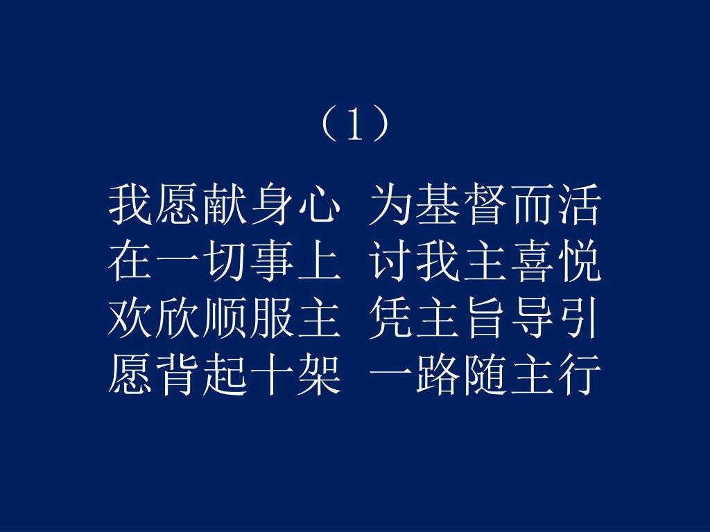 (1)我愿献身心 为基督而活在一切事上 讨我主喜悦欢欣顺服主 凭主旨导引愿背起十架 一路随主行