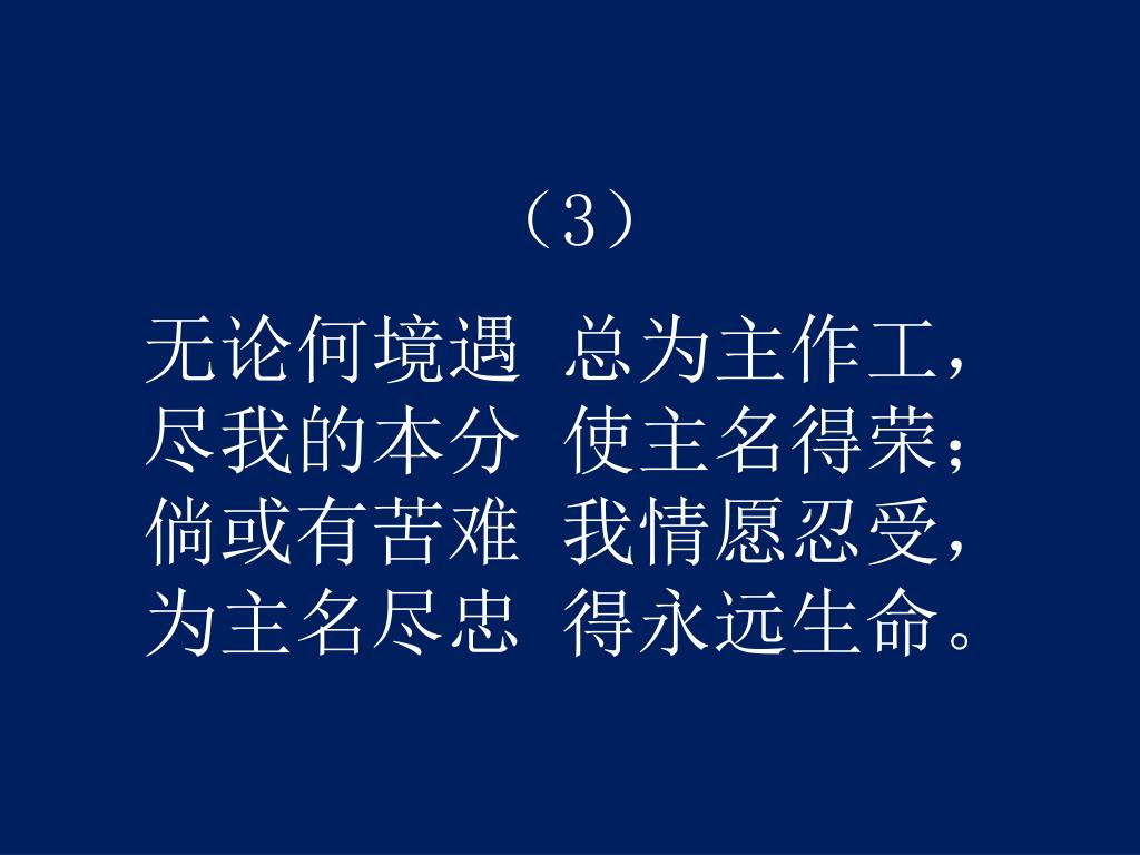(3)无论何境遇 总为主作工,尽我的本分 使主名得荣;倘或有苦难 我情愿忍受,为主名尽忠 得永远生命。