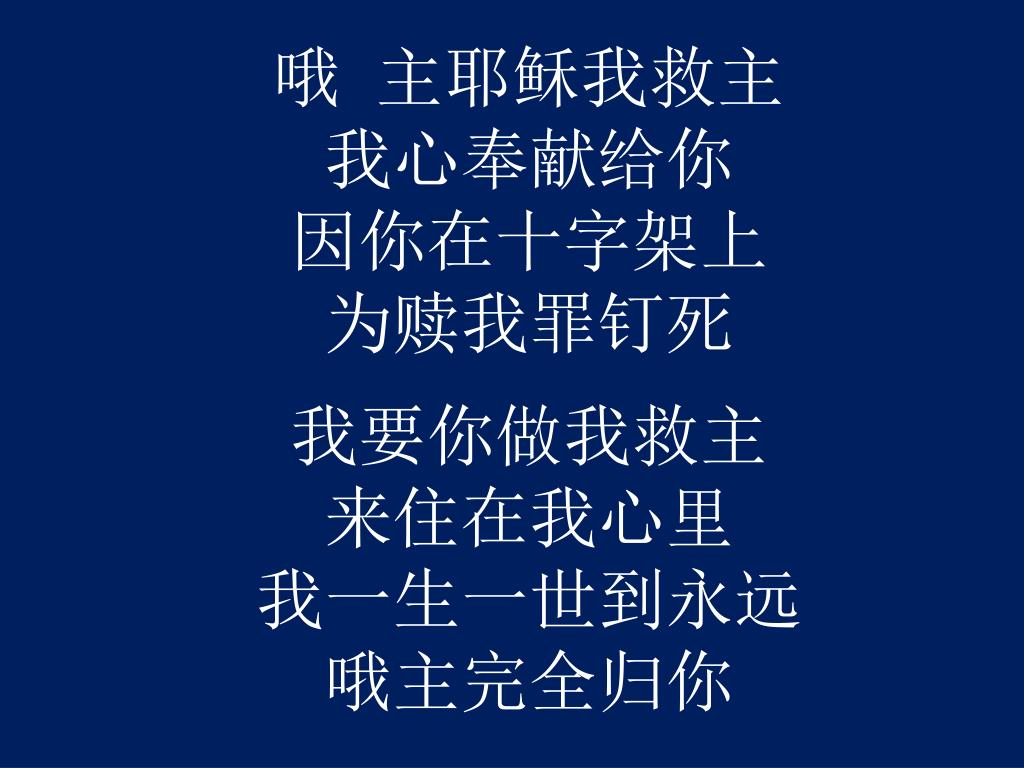 哦 主耶稣我救主 我心奉献给你 因你在十字架上 为赎我罪钉死 我要你做我救主来住在我心里我一生一世到永远哦主完全归你