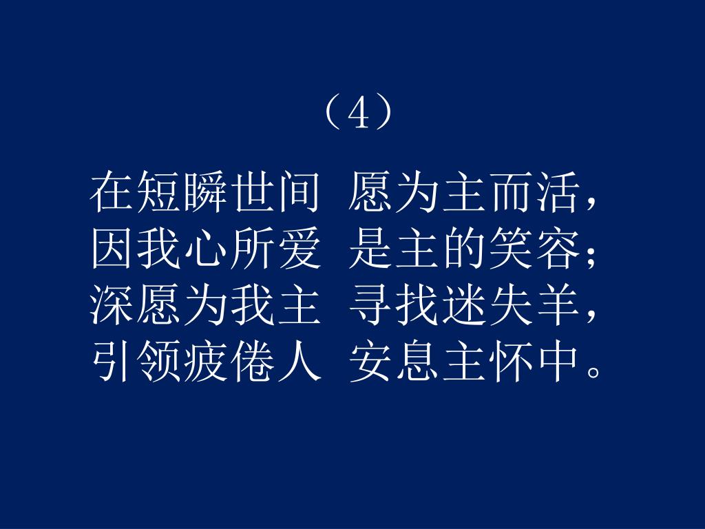 (4) 在短瞬世间愿为主而活,因我心所爱 是主的笑容;深愿为我主 寻找迷失羊,引领疲倦人 安息主怀中。