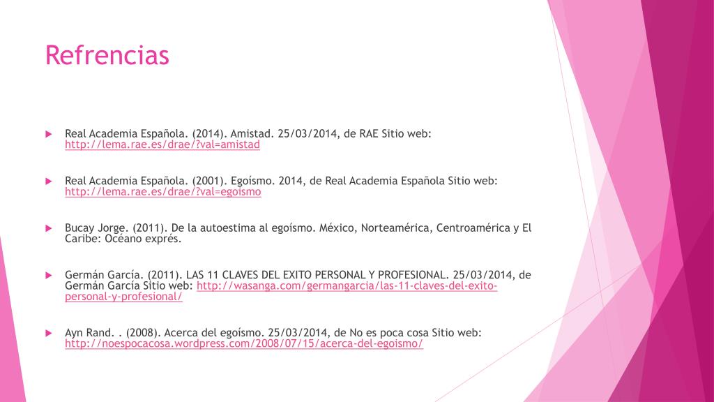Refrencias • Real Academia Española. (2014). Amistad. 25/03/2014, de RAE Sitio web: http://lema.rae.es/drae/?val=amistad • Real Academia Española. (2001). Egoísmo. 2014, de Real Academia Española Sitio web: http://lema.rae.es/drae/?val=egoismo • Bucay Jorge. (2011). De la autoestima al egoísmo. México, Norteamérica, Centroamérica y El Caribe: Océano exprés. • Germán García. (2011). LAS 11 CLAVES DEL EXITO PERSONAL Y PROFESIONAL. 25/03/2014, de Germán García Sitio web: http://wasanga.com/germangarcia/las-11-claves-del-exito-personal-y-profesional/ • Ayn Rand. . (2008). Acerca del egoísmo. 25/03/2014, de No es poca cosa Sitio web: http://noespocacosa.wordpress.com/2008/07/15/acerca-del-egoismo/