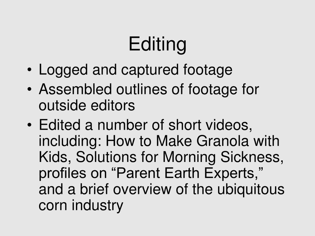 Editing • Logged and captured footage • Assembled outlines of footage for outside editors • Edited a number of short videos, including: How to Make Granola with Kids, Solutions for Morning Sickness, profiles on “Parent Earth Experts,” and a brief overview of the ubiquitous corn industry