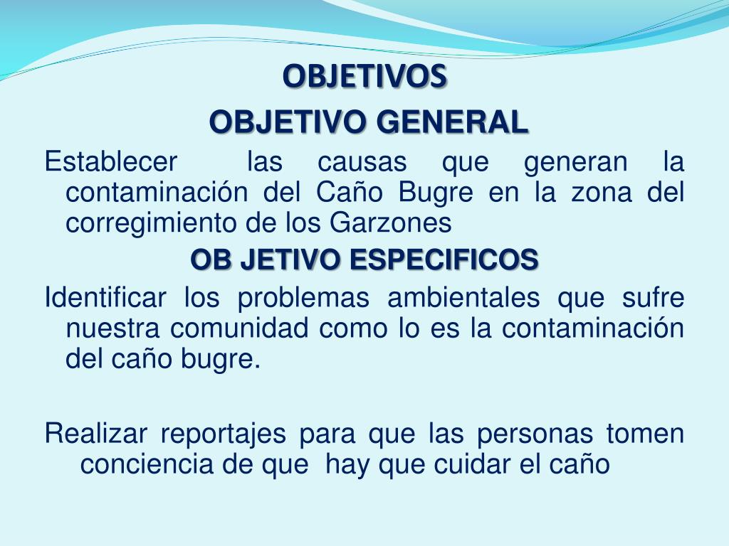 OBJETIVOS OBJETIVO GENERAL Establecer las causas que generan la contaminación del Caño Bugre en la zona del corregimiento de los Garzones OB JETIVO ESPECIFICOS Identificar los problemas ambientales que sufre nuestra comunidad como lo es la contaminación del caño bugre. Realizar reportajes para que las personas tomen conciencia de que hay que cuidar el caño