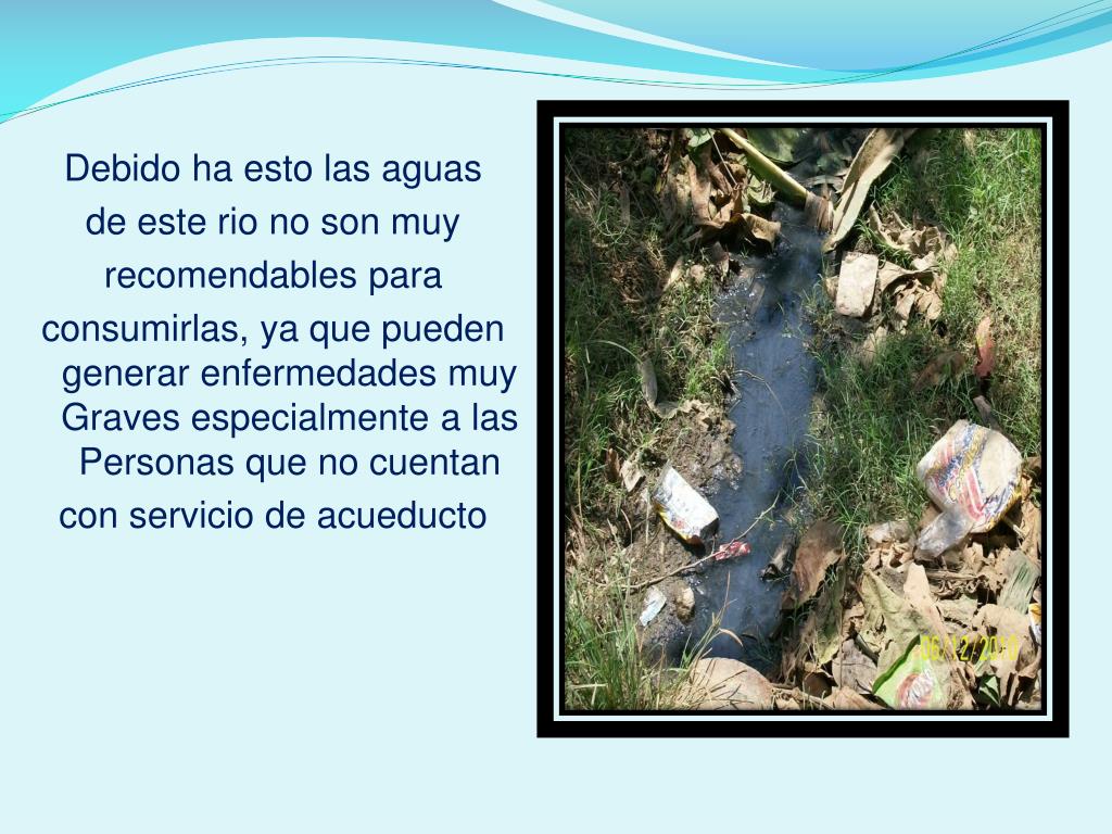 Debido ha esto las aguas de este rio no son muy recomendables para consumirlas, ya que pueden generar enfermedades muy Graves especialmente a las Personas que no cuentan con servicio de acueducto