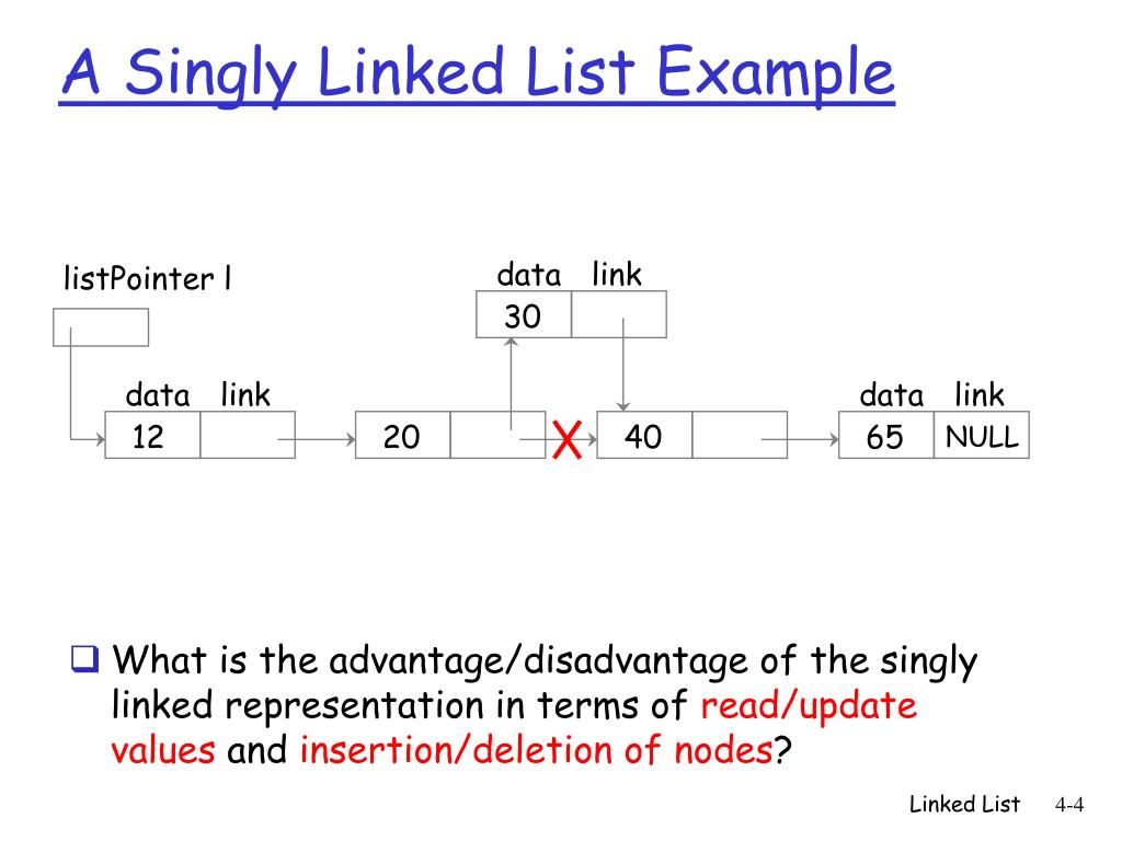 data data data link link link 12 20 40 65 30 A Singly Linked List Example listPointer l NULL • What is the advantage/disadvantage of the singly linked representationin terms of read/update values and insertion/deletion of nodes? Linked List
