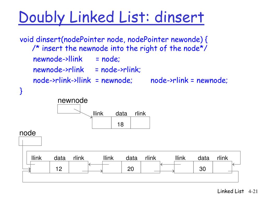 llink llink llink llink data data data data rlink rlink rlink rlink 12 20 18 30 newnode node Doubly Linked List: dinsert void dinsert(nodePointer node, nodePointernewonde) { /* insert the newnode into the rightof the node*/ newnode->llink = node; newnode->rlink= node->rlink; node->rlink->llink = newnode; node->rlink= newnode; } Linked List