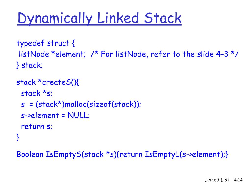 Dynamically Linked Stack typedefstruct { listNode*element; /* For listNode, refer to the slide 4-3 */ } stack; stack *createS(){ stack *s; s = (stack*)malloc(sizeof(stack)); s->element = NULL; return s; } Boolean IsEmptyS(stack *s){return IsEmptyL(s->element);} Linked List