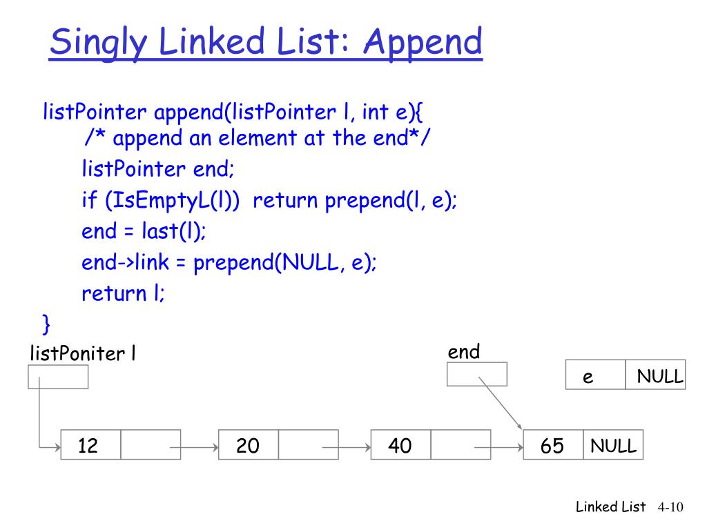 12 20 40 65 listPoniter l end e NULL NULL Singly Linked List: Append listPointer append(listPointer l, int e){ /* append an element at the end*/ listPointer end; if (IsEmptyL(l)) return prepend(l, e); end = last(l); end->link = prepend(NULL, e); return l; } Linked List