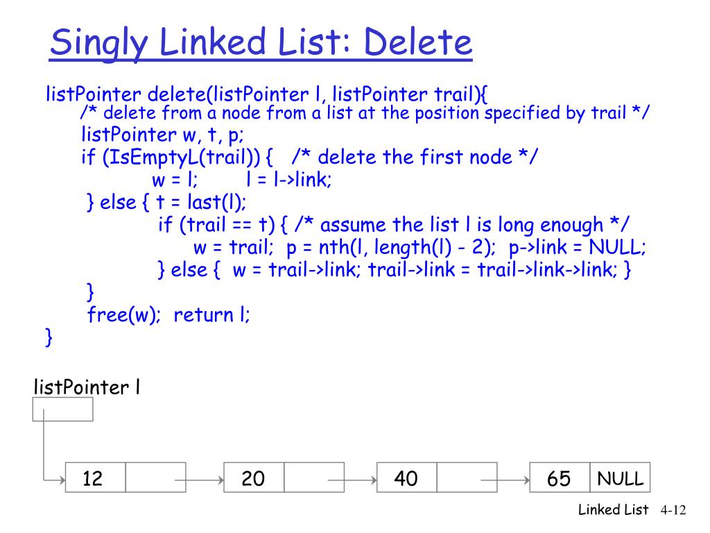 12 20 40 65 listPointer l NULL Singly Linked List: Delete listPointer delete(listPointer l, listPointer trail){ /* delete from a node from a list at the position specified by trail */ listPointer w, t, p; if (IsEmptyL(trail)) { /* delete the first node */ w = l; l = l->link; } else { t = last(l); if (trail == t) { /* assume the list l is long enough */ w = trail; p = nth(l, length(l) - 2); p->link = NULL; } else { w = trail->link; trail->link = trail->link->link; } } free(w); return l; } Linked List