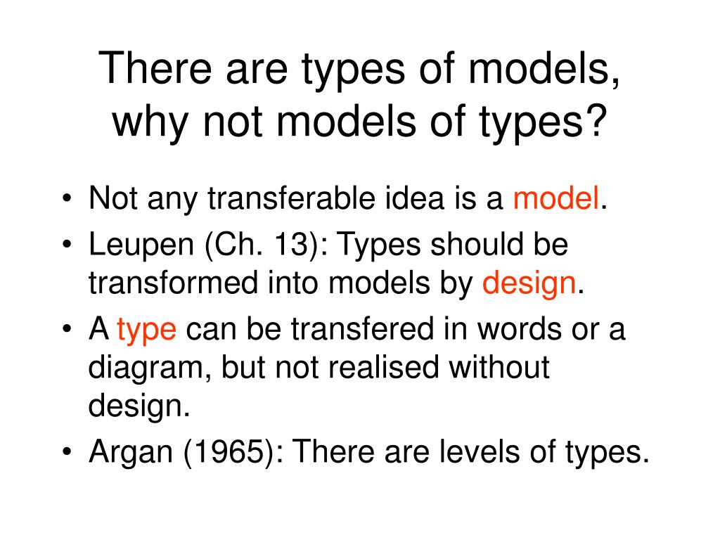There are types of models,why not models of types? • Not any transferable idea is a model. • Leupen (Ch. 13): Types should be transformed into models by design. • A type can be transfered in words or a diagram, but not realised without design. • Argan (1965): There are levels of types.