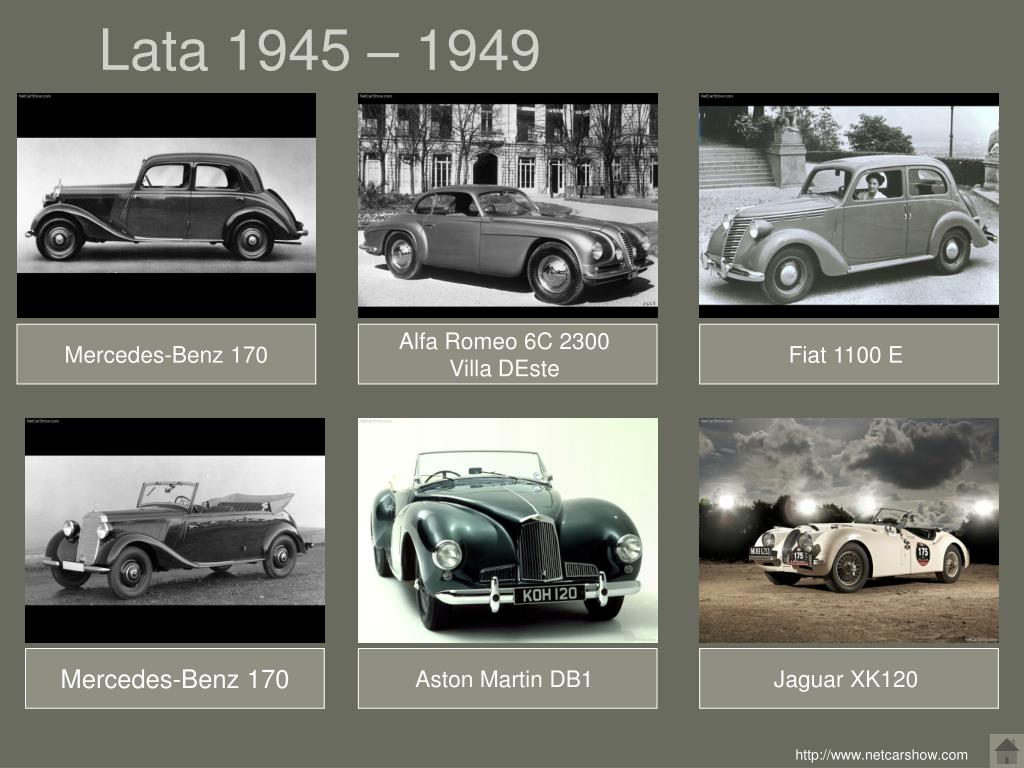 Lata 1945 – 1949 Mercedes-Benz 170 Alfa Romeo 6C 2300 Villa DEste Fiat 1100 E Mercedes-Benz 170 Aston Martin DB1 Jaguar XK120 http://www.netcarshow.com