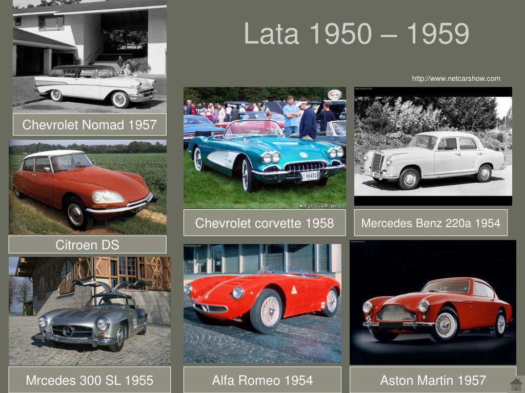 Lata 1950 – 1959 http://www.netcarshow.com Chevrolet Nomad 1957 Chevrolet corvette 1958 Mercedes Benz 220a 1954 Citroen DS Mrcedes 300 SL 1955 Alfa Romeo 1954 Aston Martin 1957
