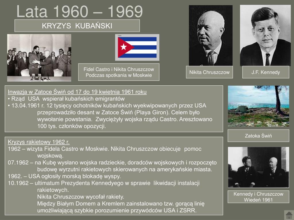 Lata 1960 – 1969 KRYZYS KUBAŃSKI Fidel Castro i Nikita Chruszczow Podczas spotkania w Moskwie Nikita Chruszczow J.F. Kennedy • Inwazja w Zatoce Świń od 17 do 19 kwietnia 1961 roku • Rząd USA wspierał kubańskich emigrantów • 13.04.1961 r. 12 tysięcy ochotników kubańskich wyekwipowanych przez USA • przeprowadziło desant w Zatoce Świń (Playa Giron). Celem było • wywołanie powstania. Zwyciężyły wojska rządu Castro. Aresztowano • 100 tys. członków opozycji. Zatoka Świń Kryzys rakietowy 1962 r. 1962 – wizyta Fidela Castro w Moskwie. Nikita Chruszczow obiecuje pomoc wojskową. 07.1962 – na Kubę wysłano wojska radzieckie, doradców wojskowych i rozpoczęto budowę wyrzutni rakietowych skierowanych na amerykańskie miasta. 1962. – USA ogłosiły morską blokadę wyspy. 10.1962 – ultimatum Prezydenta Kennedyego w sprawie likwidacji instalacji rakietowych. Nikita Chruszczow wycofał rakiety. Między Białym Domem a Kremlem zainstalowano tzw. gorącą linię umożliwiającą szybkie porozumienie przywódców USA i ZSRR. Kennedy i Chruszczow Wiedeń 1961