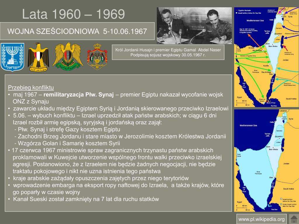 Lata 1960 – 1969 WOJNA SZEŚCIODNIOWA 5-10.06.1967 Król Jordanii Husajn i premier Egiptu Gamal Abdel Naser Podpisują sojusz wojskowy 30.05.1967 r. • Przebieg konfliktu • maj 1967 – remilitaryzacja Płw. Synaj – premier Egiptu nakazał wycofanie wojsk • ONZ z Synaju • zawarcie układu między Egiptem Syrią i Jordanią skierowanego przeciwko Izraelowi • 5.06. – wybuch konfliktu – Izrael uprzedził atak państw arabskich; w ciągu 6 dni • Izrael rozbił armię egipską, syryjską i jordańską oraz zajął: • - Płw. Synaj i strefę Gazy kosztem Egiptu • - Zachodni Brzeg Jordanu i stare miasto w Jerozolimie kosztem Królestwa Jordanii • - Wzgórza Golan i Samarię kosztem Syrii • 17 czerwca 1967 ministrowie spraw zagranicznych trzynastu państw arabskich • proklamowali w Kuwejcie utworzenie wspólnego frontu walki przeciwko izraelskiej • agresji. Postanowiono, że z Izraelem nie będzie żadnych negocjacji, nie będzie • traktatu pokojowego i nikt nie uzna istnienia tego państwa • kraje arabskie zażądały opuszczenia zajętych przez niego terytoriów • wprowadzenie embarga na eksport ropy naftowej do Izraela, a także krajów, które • go poparły w czasie wojny • Kanał Sueski został zamknięty na 7 lat dla ruchu statków www.pl.wikipedia.org