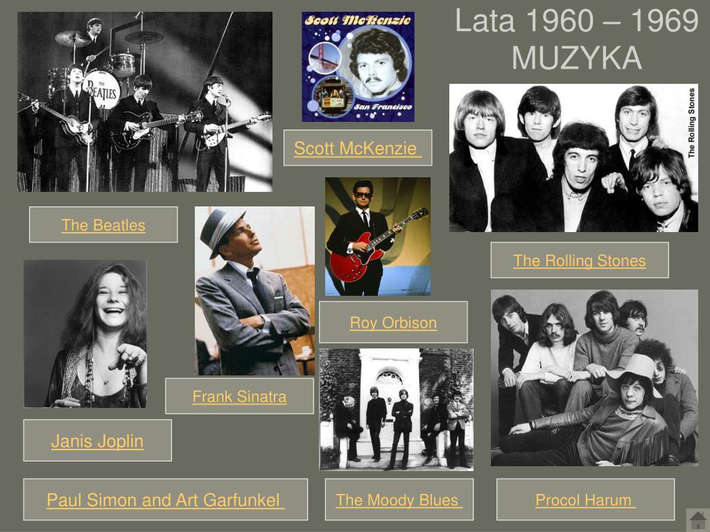 Lata 1960 – 1969MUZYKA Scott McKenzie The Beatles The Rolling Stones Roy Orbison Frank Sinatra Janis Joplin Paul Simon and Art Garfunkel The Moody Blues Procol Harum