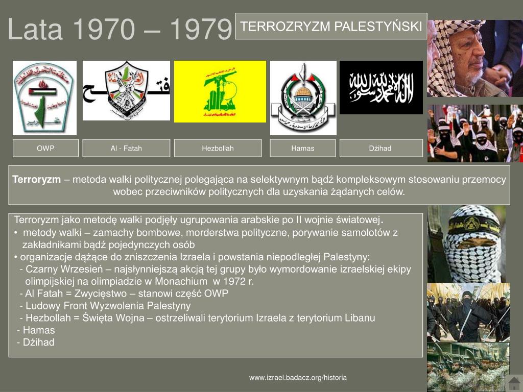 Lata 1970 – 1979 TERROZRYZM PALESTYŃSKI OWP Al - Fatah Hezbollah Hamas Dżihad Terroryzm – metoda walki politycznej polegająca na selektywnym bądź kompleksowym stosowaniu przemocy wobec przeciwników politycznych dla uzyskania żądanych celów. • Terroryzm jako metodę walki podjęły ugrupowania arabskie po II wojnie światowej. • metody walki – zamachy bombowe, morderstwa polityczne, porywanie samolotów z • zakładnikami bądź pojedynczych osób • organizacje dążące do zniszczenia Izraela i powstania niepodległej Palestyny: • - Czarny Wrzesień – najsłynniejszą akcją tej grupy było wymordowanie izraelskiej ekipy • olimpijskiej na olimpiadzie w Monachium w 1972 r. • - Al Fatah = Zwycięstwo – stanowi część OWP • - Ludowy Front Wyzwolenia Palestyny • - Hezbollah = Święta Wojna – ostrzeliwali terytorium Izraela z terytorium Libanu • - Hamas • - Dżihad www.izrael.badacz.org/historia