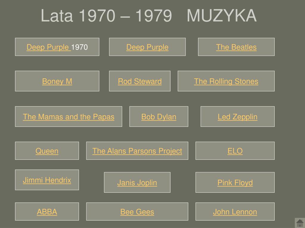 Lata 1970 – 1979 MUZYKA Deep Purple 1970 Deep Purple The Beatles Boney M Rod Steward The Rolling Stones The Mamas and the Papas Bob Dylan Led Zepplin Queen The Alans Parsons Project ELO Jimmi Hendrix Janis Joplin Pink Floyd ABBA Bee Gees John Lennon