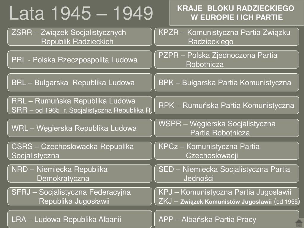 Lata 1945 – 1949 KRAJE BLOKU RADZIECKIEGO W EUROPIE I ICH PARTIE ZSRR – Związek Socjalistycznych Republik Radzieckich KPZR – Komunistyczna Partia Związku Radzieckiego PRL - Polska Rzeczpospolita Ludowa PZPR – Polska Zjednoczona Partia Robotnicza BRL – Bułgarska Republika Ludowa BPK – Bułgarska Partia Komunistyczna RRL – Rumuńska Republika Ludowa SRR – od 1965 r. Socjalistyczna Republika R. RPK – Rumuńska Partia Komunistyczna WRL – Węgierska Republika Ludowa WSPR – Węgierska Socjalistyczna Partia Robotnicza CSRS – Czechosłowacka Republika Socjalistyczna KPCz – Komunistyczna Partia Czechosłowacji NRD – Niemiecka Republika Demokratyczna SED – Niemiecka Socjalistyczna Partia Jedności SFRJ – Socjalistyczna Federacyjna Republika Jugosławii KPJ – Komunistyczna Partia Jugosławii ZKJ – Związek Komunistów Jugosławii (od 1955) LRA – Ludowa Republika Albanii APP – Albańska Partia Pracy