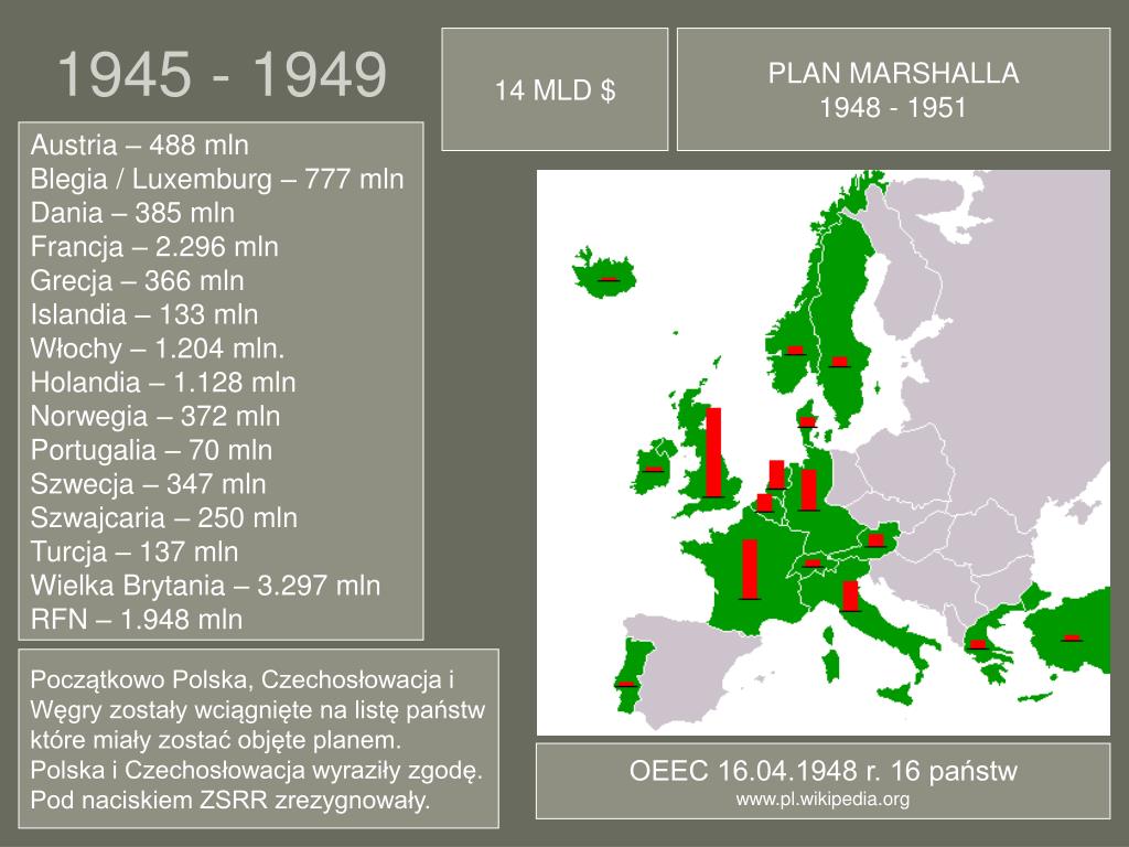 1945 - 1949 14 MLD $ PLAN MARSHALLA 1948 - 1951 Austria – 488 mln Blegia / Luxemburg – 777 mln Dania – 385 mln Francja – 2.296 mln Grecja – 366 mln Islandia – 133 mln Włochy – 1.204 mln. Holandia – 1.128 mln Norwegia – 372 mln Portugalia – 70 mln Szwecja – 347 mln Szwajcaria – 250 mln Turcja – 137 mln Wielka Brytania – 3.297 mln RFN – 1.948 mln Początkowo Polska, Czechosłowacja i Węgry zostały wciągnięte na listę państw które miały zostać objęte planem. Polska i Czechosłowacja wyraziły zgodę. Pod naciskiem ZSRR zrezygnowały. OEEC 16.04.1948 r. 16 państw www.pl.wikipedia.org