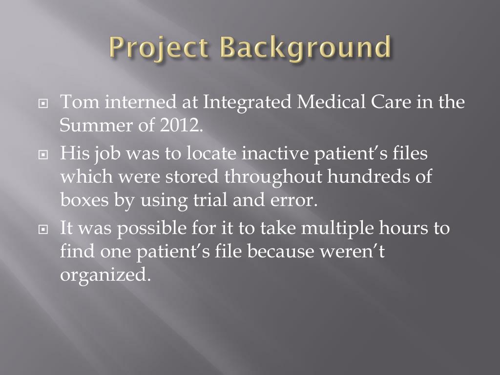 Project Background • Tom interned at Integrated Medical Care in the Summer of 2012. • His job was to locate inactive patient’s files which were stored throughout hundreds of boxes by using trial and error. • It was possible for it to take multiple hours to find one patient’s file because weren’t organized.