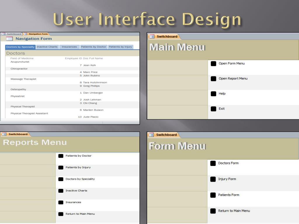 Business Opportunity • Provide the company with a list of the most used insurance companies. • Sort which doctors can treat specific injuries, and show how busy they currently are. • Show the most common types of injuries treated, to help keep inventory up to date. • Get reports of when files can be discarded (after 7 years).
