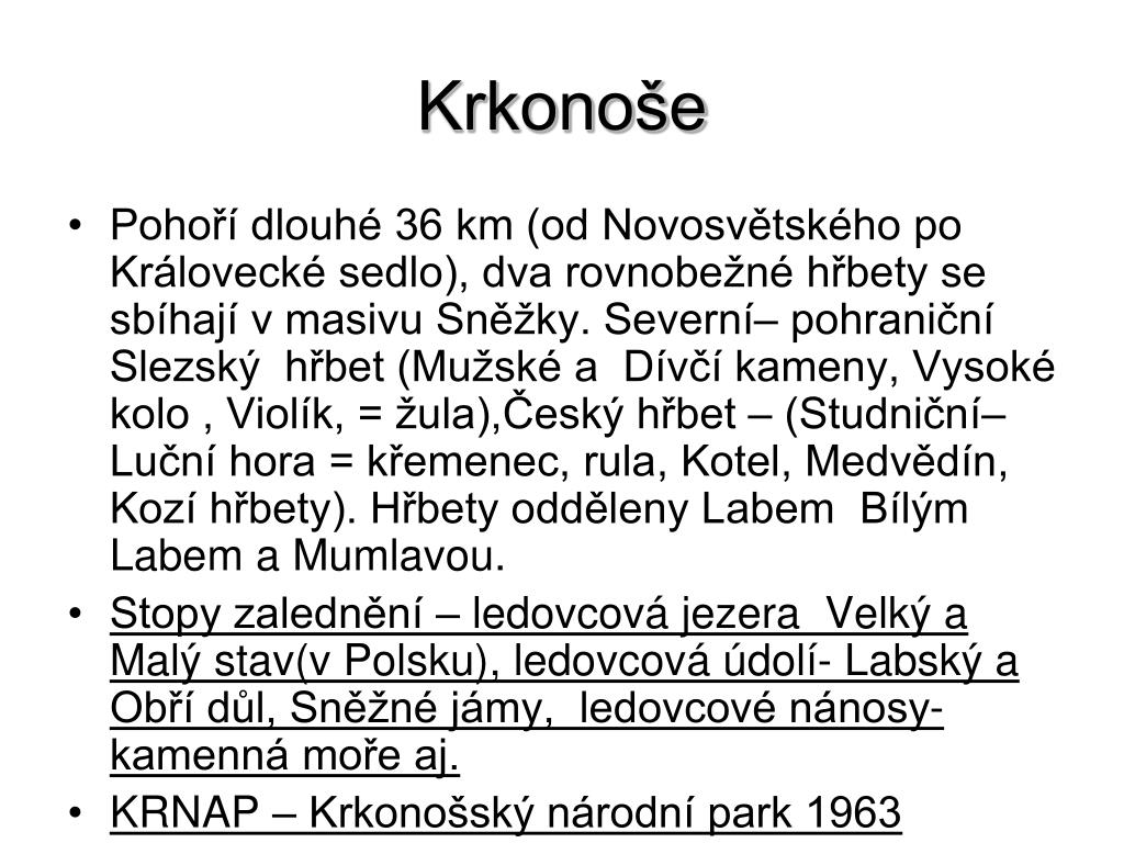 Krkonoše • Pohoří dlouhé 36 km (od Novosvětského po Královecké sedlo), dva rovnobežné hřbety se sbíhají v masivu Sněžky. Severní– pohraniční Slezský hřbet (Mužské a Dívčí kameny, Vysoké kolo , Violík, = žula),Český hřbet – (Studniční– Luční hora = křemenec, rula, Kotel, Medvědín, Kozí hřbety). Hřbety odděleny Labem Bílým Labem a Mumlavou. • Stopy zalednění – ledovcová jezera Velký a Malý stav(v Polsku), ledovcová údolí- Labský a Obří důl, Sněžné jámy, ledovcové nánosy-kamenná moře aj. • KRNAP – Krkonošský národní park 1963