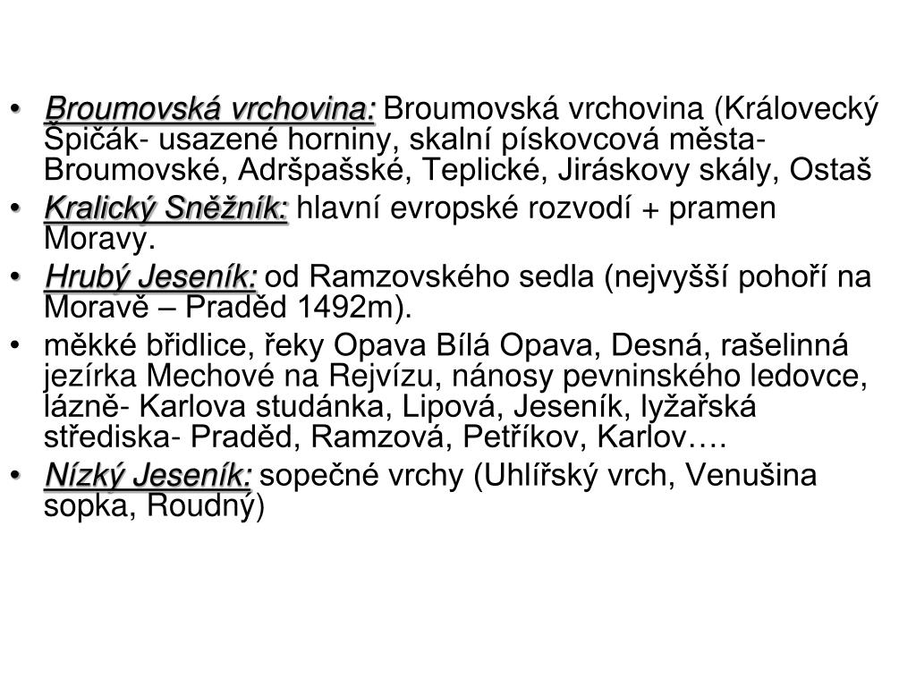 Broumovská vrchovina: Broumovská vrchovina (Královecký Špičák- usazené horniny, skalní pískovcová města-Broumovské, Adršpašské, Teplické, Jiráskovy skály, Ostaš • Kralický Sněžník: hlavní evropské rozvodí + pramen Moravy. • Hrubý Jeseník: od Ramzovského sedla (nejvyšší pohoří na Moravě – Praděd 1492m). • měkké břidlice, řeky Opava Bílá Opava, Desná, rašelinná jezírka Mechové na Rejvízu, nánosy pevninského ledovce, lázně- Karlova studánka, Lipová, Jeseník, lyžařská střediska- Praděd, Ramzová, Petříkov, Karlov…. • Nízký Jeseník: sopečné vrchy (Uhlířský vrch, Venušina sopka, Roudný)