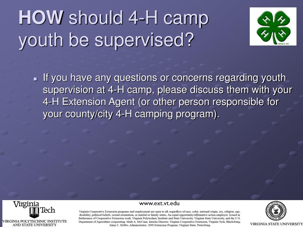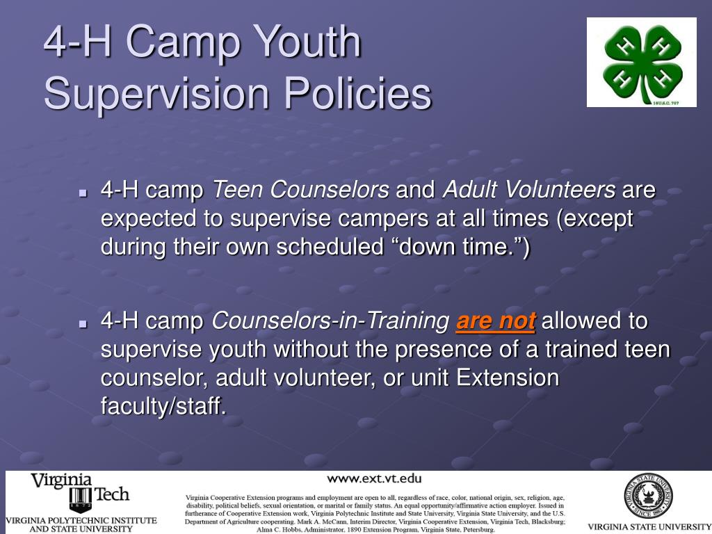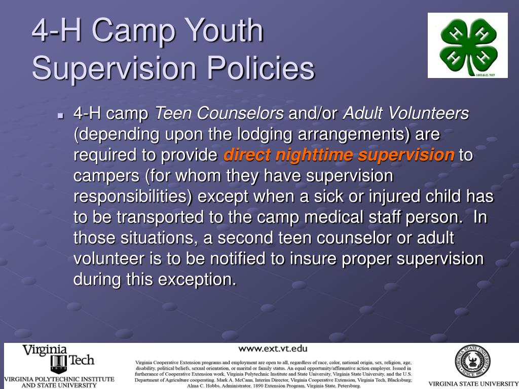 4-H Camp Youth Supervision Policies • As a 4-H camp volunteer, you should be informed in writing of your supervisory responsibilities over youth campers. • Talk to your 4-H Extension Agent (or other person responsible for your county/city 4-H camping program) for more information.