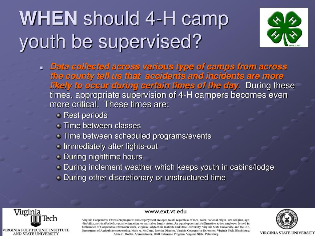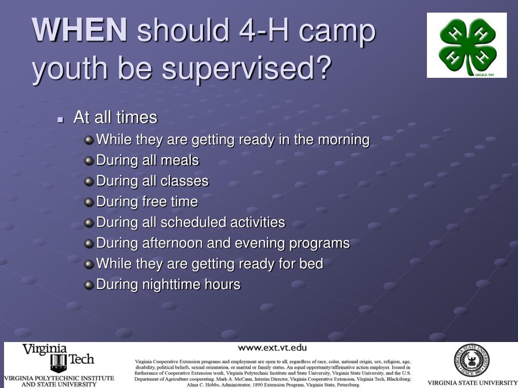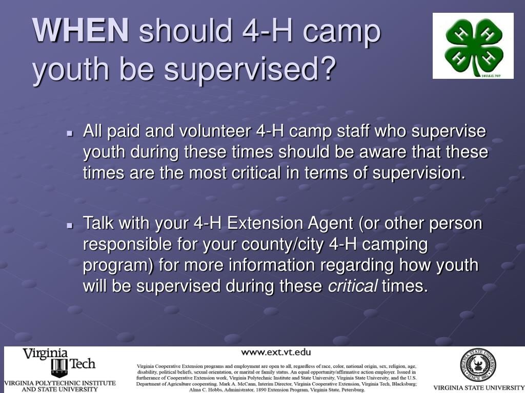 WHEN should 4-H camp youth be supervised? • All paid and volunteer 4-H camp staff who supervise youth during these times should be aware that these times are the most critical in terms of supervision. • Talk with your 4-H Extension Agent (or other person responsible for your county/city 4-H camping program) for more information regarding how youth will be supervised during these critical times.