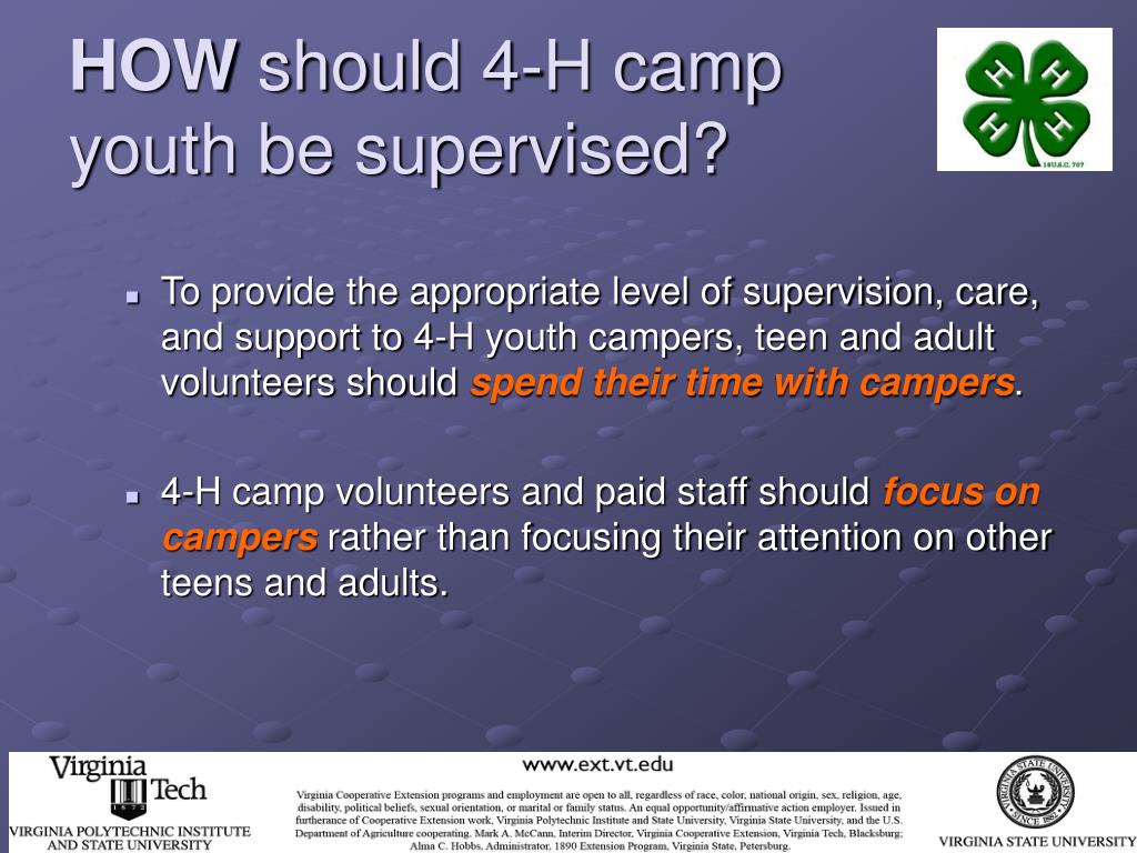 HOW should 4-H camp youth be supervised? • To provide the appropriate level of supervision, care, and support to 4-H youth campers, teen and adult volunteers should spend their time with campers. • 4-H camp volunteers and paid staff should focus on campers rather than focusing their attention on other teens and adults.