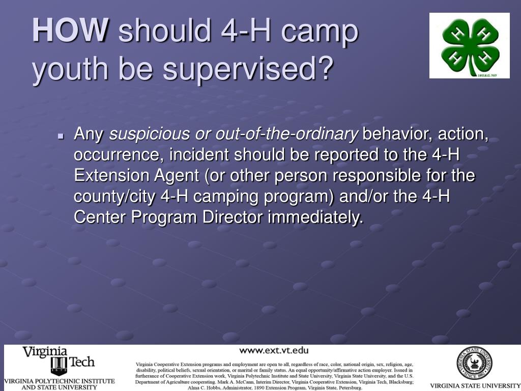 HOW should 4-H camp youth be supervised? • Any suspicious orout-of-the-ordinary behavior, action, occurrence, incident should be reported to the 4-H Extension Agent (or other person responsible for the county/city 4-H camping program) and/or the 4-H Center Program Director immediately.