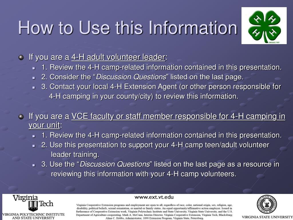 How to Use this Information • If you are a 4-H adult volunteer leader: • 1. Review the 4-H camp-related information contained in this presentation. • 2. Consider the “Discussion Questions” listed on the last page. • 3. Contact your local 4-H Extension Agent (or other person responsible for 4-H camping in your county/city) to review this information. • If you are a VCE faculty or staff member responsible for 4-H camping in your unit: • 1. Review the 4-H camp-related information contained in this presentation. • 2. Use this presentation to support your 4-H camp teen/adult volunteer leader training. • 3. Use the “Discussion Questions” listed on the last page as a resource in reviewing this information with your 4-H camp volunteers.