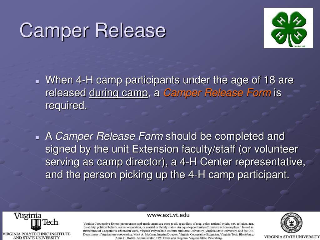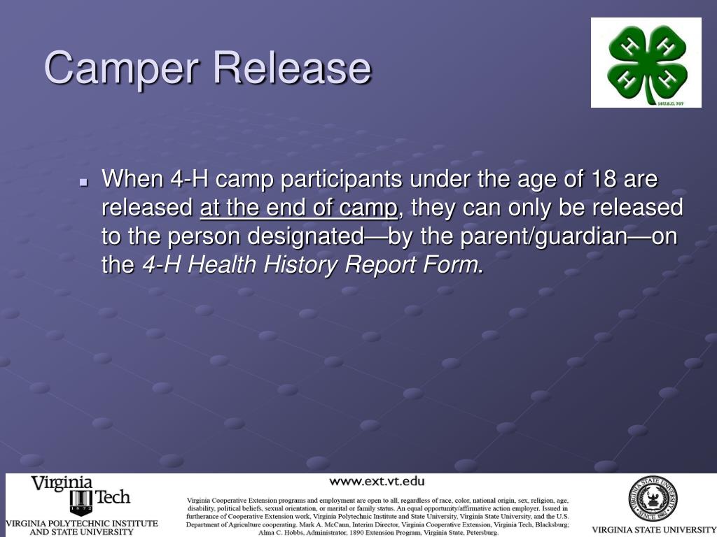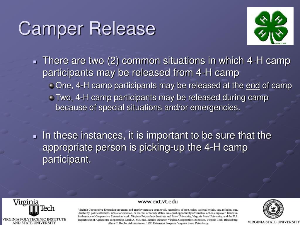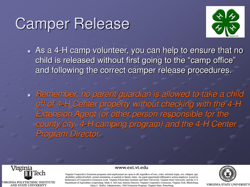 Camper Release • As a 4-H camp volunteer, you can help to ensure that no child is released without first going to the “camp office” and following the correct camper release procedures. • Remember, no parent/guardian is allowed to take a child off of 4-H Center property without checking with the 4-H Extension Agent (or other person responsible for the county/city 4-H camping program) and the 4-H Center Program Director.