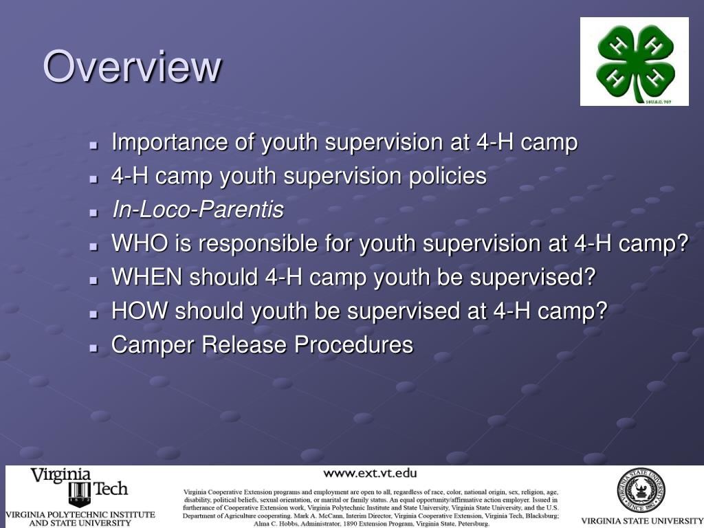 Overview • Importance of youth supervision at 4-H camp • 4-H camp youth supervision policies • In-Loco-Parentis • WHO is responsible for youth supervision at 4-H camp? • WHEN should 4-H camp youth be supervised? • HOW should youth be supervised at 4-H camp? • Camper Release Procedures