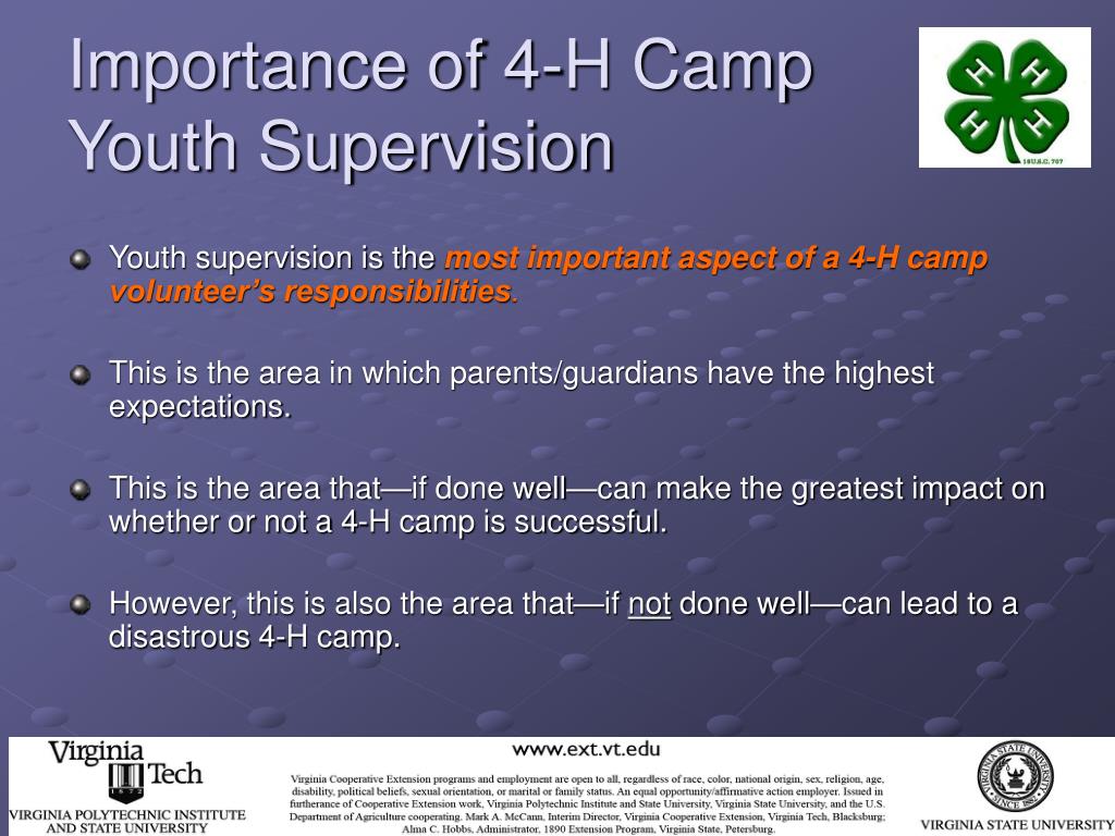 Importance of 4-H Camp Youth Supervision • Youth supervision is the most important aspect of a 4-H camp volunteer’s responsibilities. • This is the area in which parents/guardians have the highest expectations. • This is the area that—if done well—can make the greatest impact on whether or not a 4-H camp is successful. • However, this is also the area that—if not done well—can lead to a disastrous 4-H camp.
