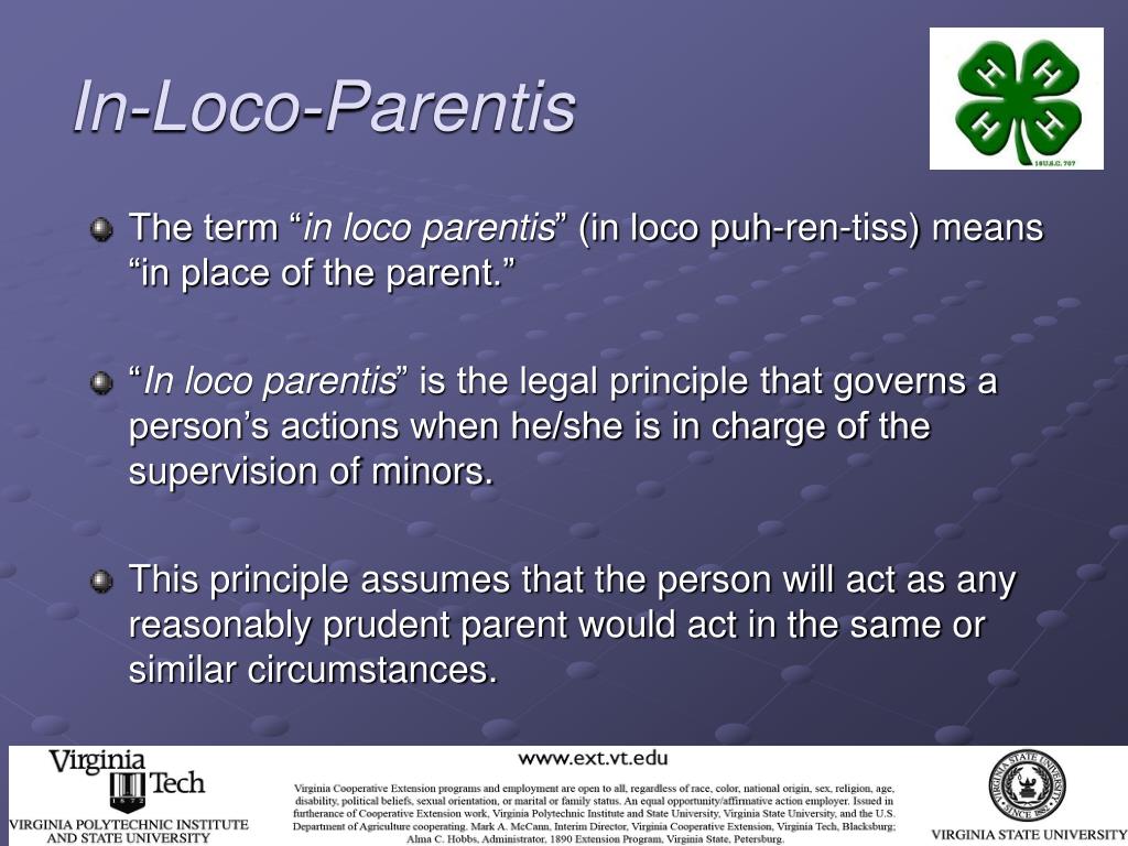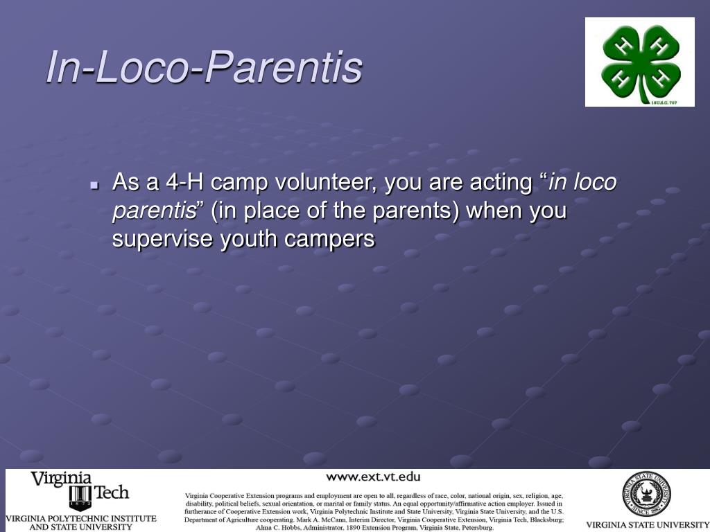 In-Loco-Parentis • As a 4-H camp volunteer, you are acting “in loco parentis” (in place of the parents) when you supervise youth campers
