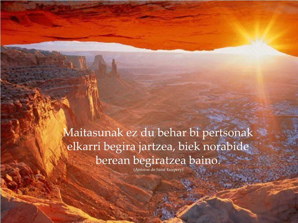 Maitasunak ez du behar bi pertsonak elkarri begira jartzea, biek norabide berean begiratzea baino.(Antoine de Saint Exupery)