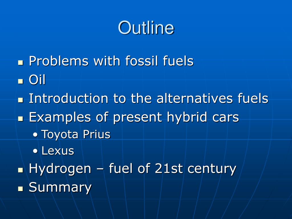 Outline • Problems with fossil fuels • Oil • Introduction to the alternatives fuels • Examples of present hybrid cars • Toyota Prius • Lexus • Hydrogen – fuel of 21st century • Summary