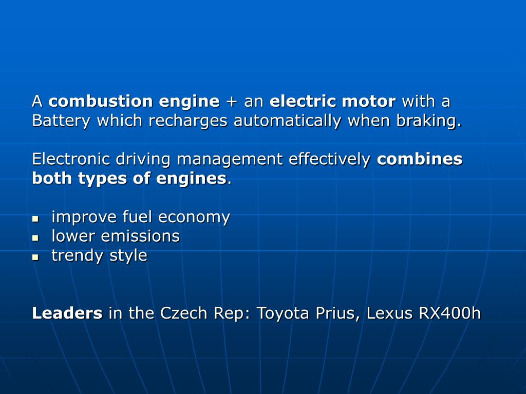 A combustion engine+ an electric motor with a Battery which recharges automatically when braking. Electronic driving management effectively combines both types of engines. • improve fuel economy • lower emissions • trendy style Leaders in the Czech Rep: Toyota Prius, Lexus RX400h