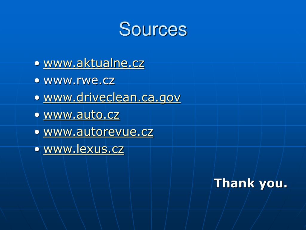 Sources • www.aktualne.cz • www.rwe.cz • www.driveclean.ca.gov • www.auto.cz • www.autorevue.cz • www.lexus.cz Thank you.