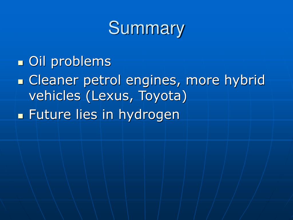 Summary • Oil problems • Cleaner petrol engines, more hybrid vehicles (Lexus, Toyota) • Future lies in hydrogen