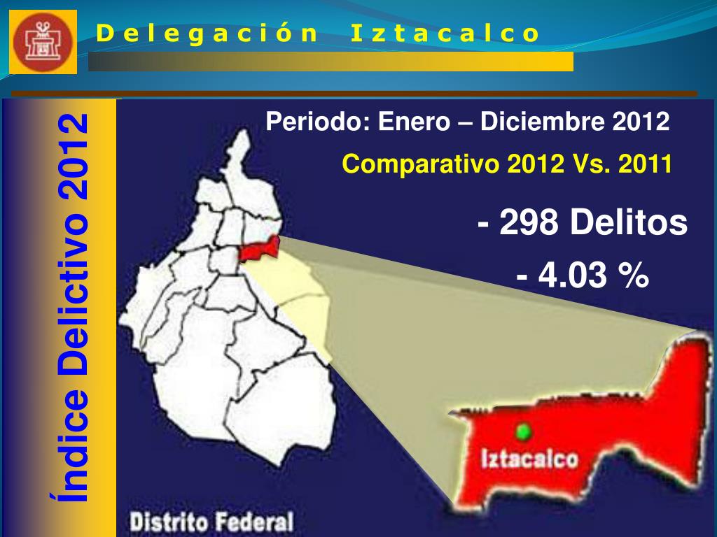 D e l e g a c i ó n I z t a c a l c o Periodo: Enero – Diciembre 2012 Comparativo 2012 Vs. 2011 - 298 Delitos - 4.03 % Índice Delictivo 2012